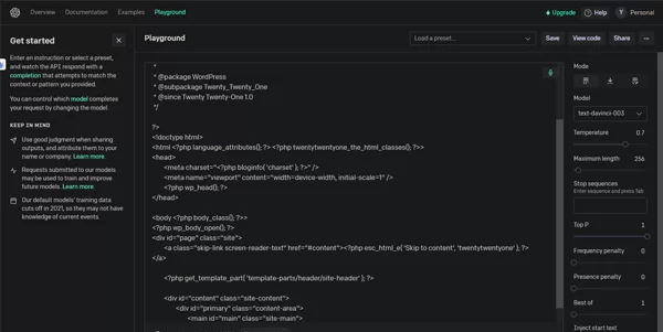 Inside the Playground you can select from various AI models and even define how creative or exact the response should be by sliding a few simple sliders or picking a model from a dropdown menu.